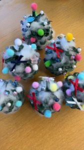 皆さん思い思いに飾りを付けて、てっぺんに星をつけ、植木鉢に色とりどりの
