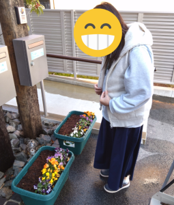 お手伝いしてくださる女性入居者様に頑張っていただいて、3本植えてみました。